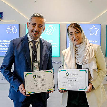 طبيبان من جونز هوبكنز أرامكو للرعاية الصحية (JHAH) هما أول طبيبين في المملكة العربية السعودية يحصلان على زمالات من كلية القيادة والإدارة الطبية في المملكة المتحدة.